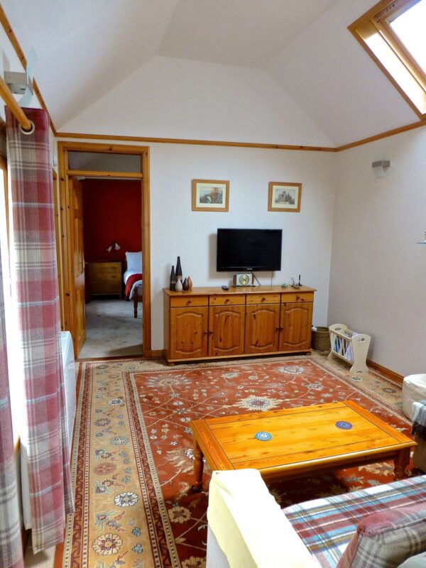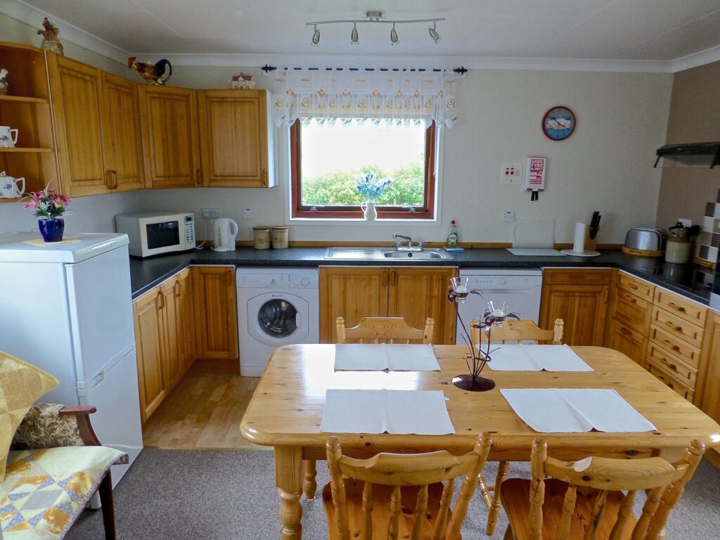 Crofthouse is a beautifully furnished and decorated one-bedroom holiday home, perfect for couples and small families seeking a tranquil escape. The property features a large kitchen and dining area with all the modern amenities you need to prepare and enjoy meals, including an electric cooker, dishwasher, microwave, washing machine, and fridge freezer. The dining table can comfortably seat six people, making it an ideal space for socializing and enjoying meals together.